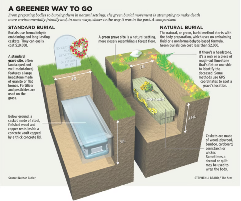 Below is a diagram by Nathan Butler that shows the difference between a traditional coffin-in-the-graveyard burial and a green burial: