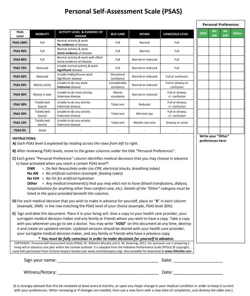 The PSAS goes over what DNR means in actuality and will help you to determine at what point you do not want medical intervention. As always you can be as detailed as you want by writing in variables (i.e. “I don’t want to be on any life support unless I’ve become a parent” or “I want the medical professionals to do everything they can to bring me back to life if I’m in a coma for two months, but after two months I want to be taken off life support”). This as with the Advance Directive, should be continually updated throughout your life as you learn and grow and change. The form with the most recent date will automatically cancel out all the previous ones. If you would like this in PDF form just email me and I’ll share: deathmedyingtree@gmail.com
