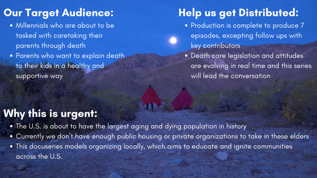We’ve been hosting virtual and in-person mourning events, monthly grief support gatherings, death meditations, end of life file creation resources and more from 2018 to today as well- as outreach is an essential component to this documentary.